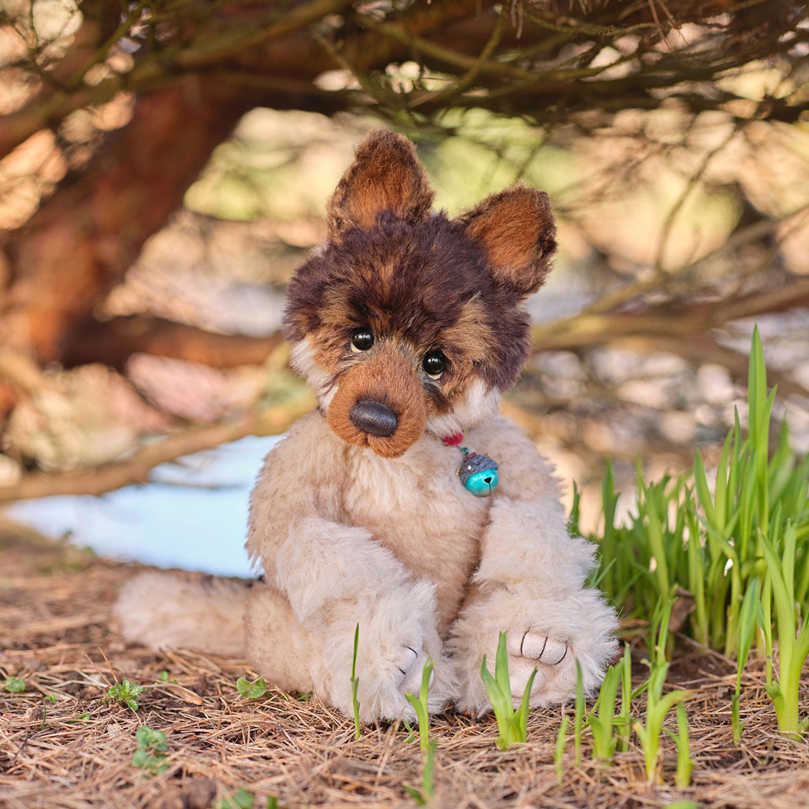 首元にはスカイブルーの鈴付きの首輪をあしらい、遊び心のある可愛らしいアクセントに。